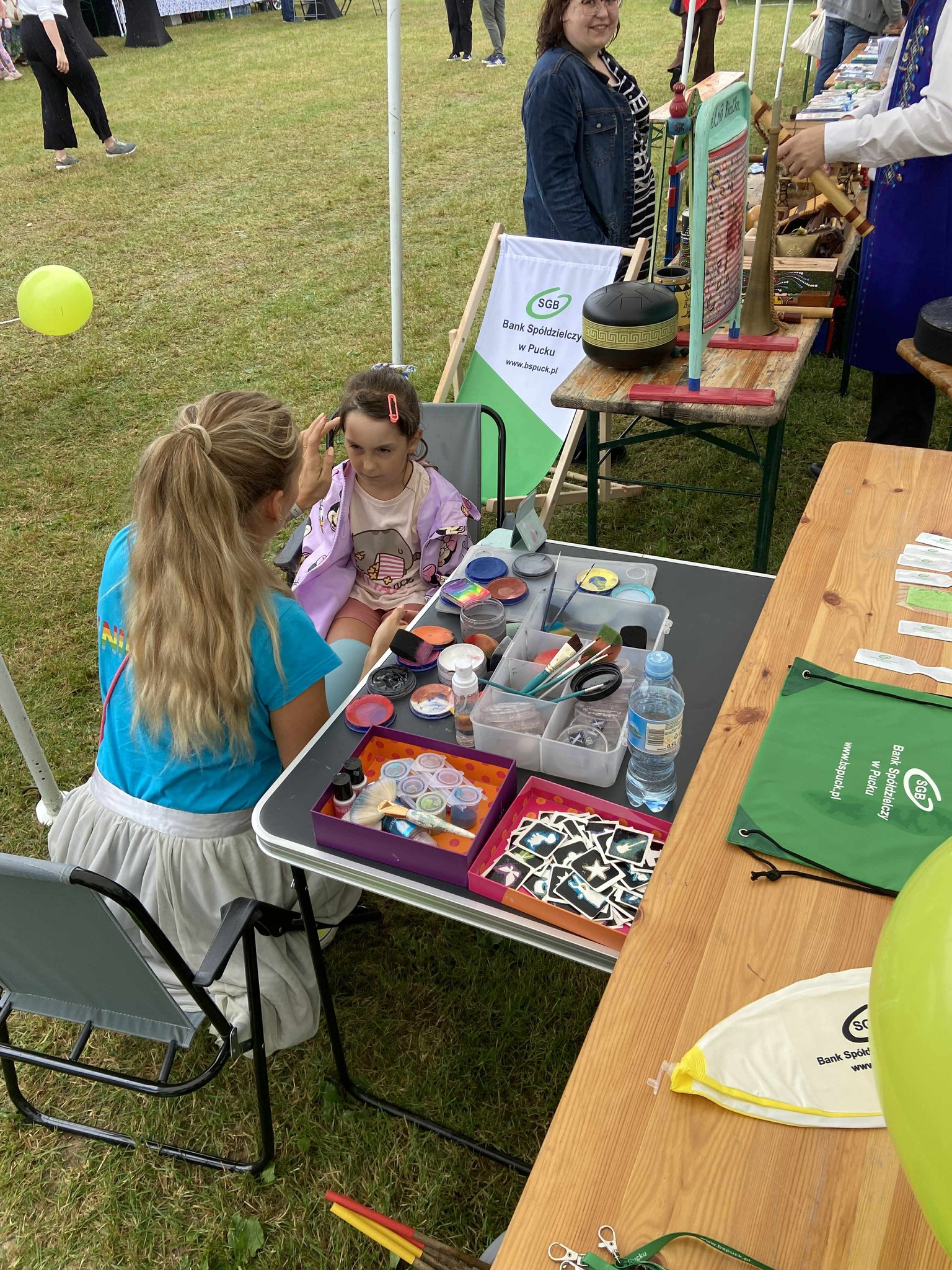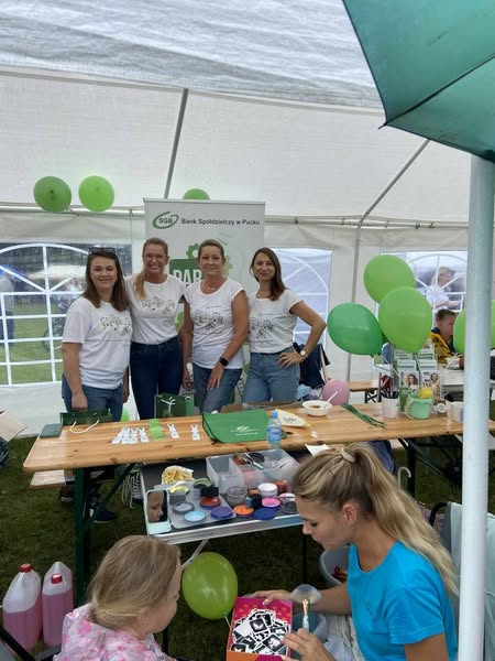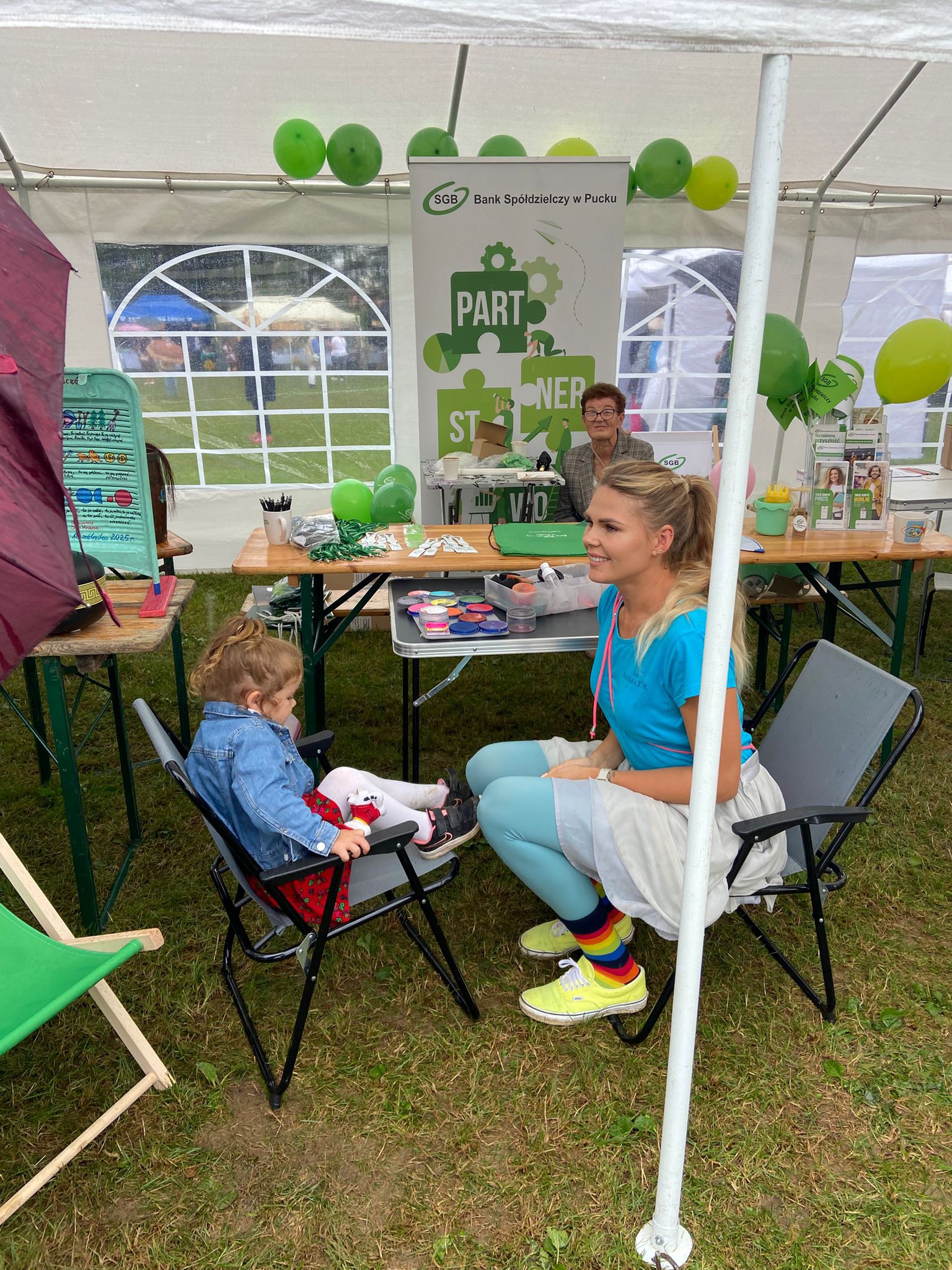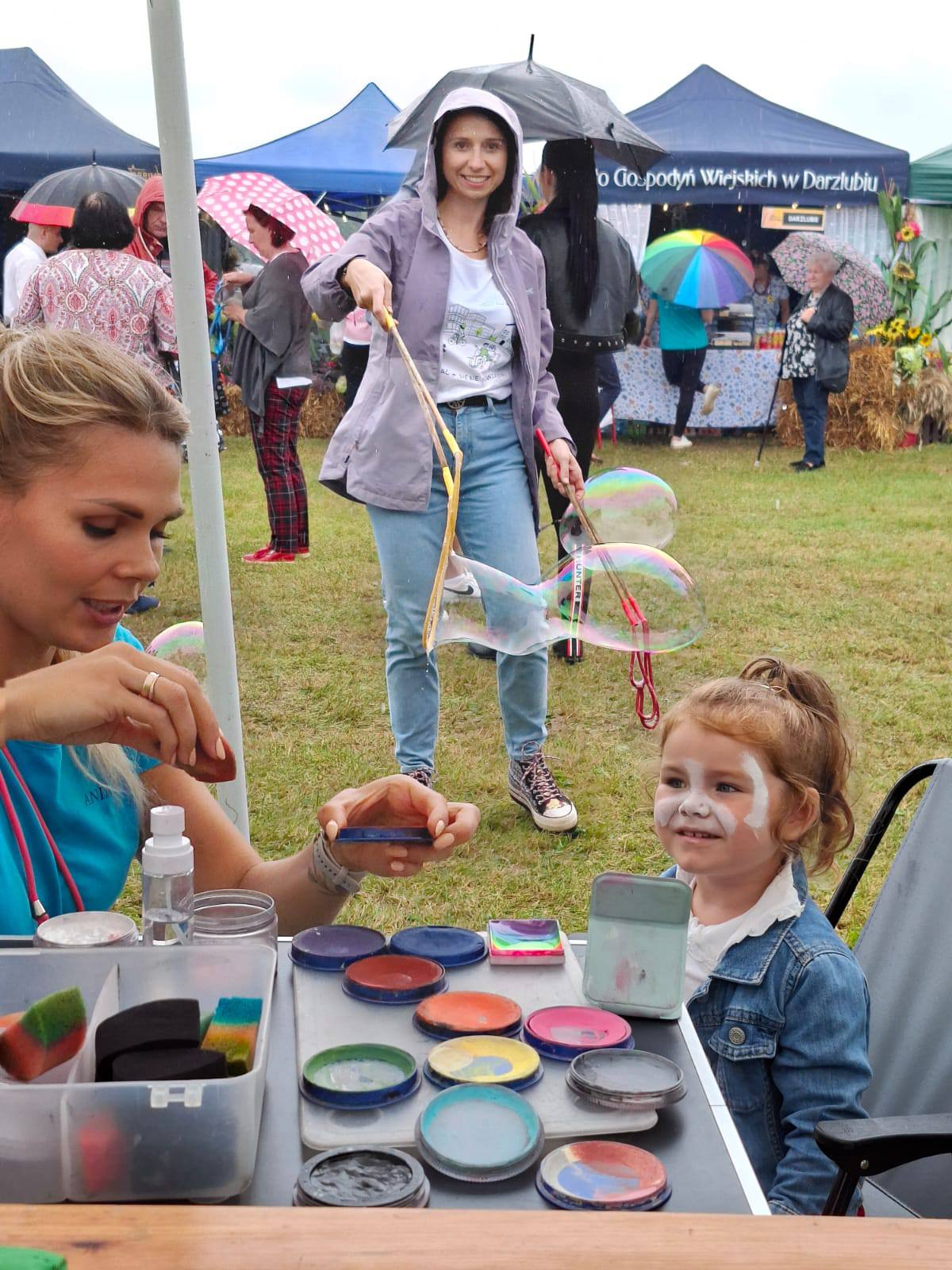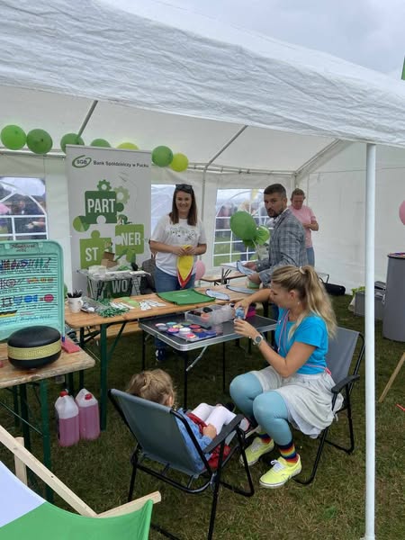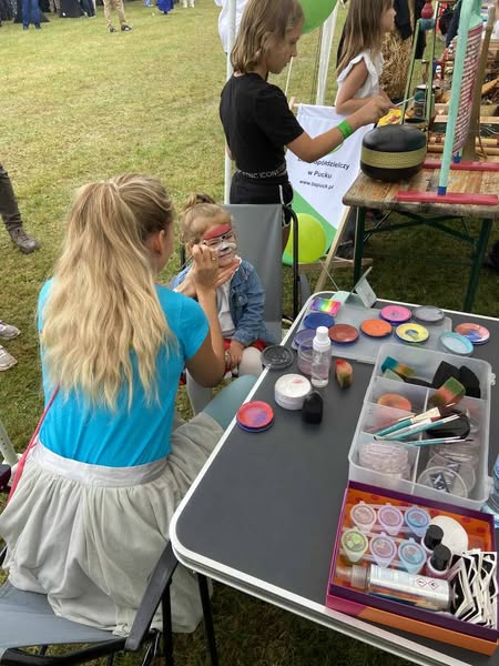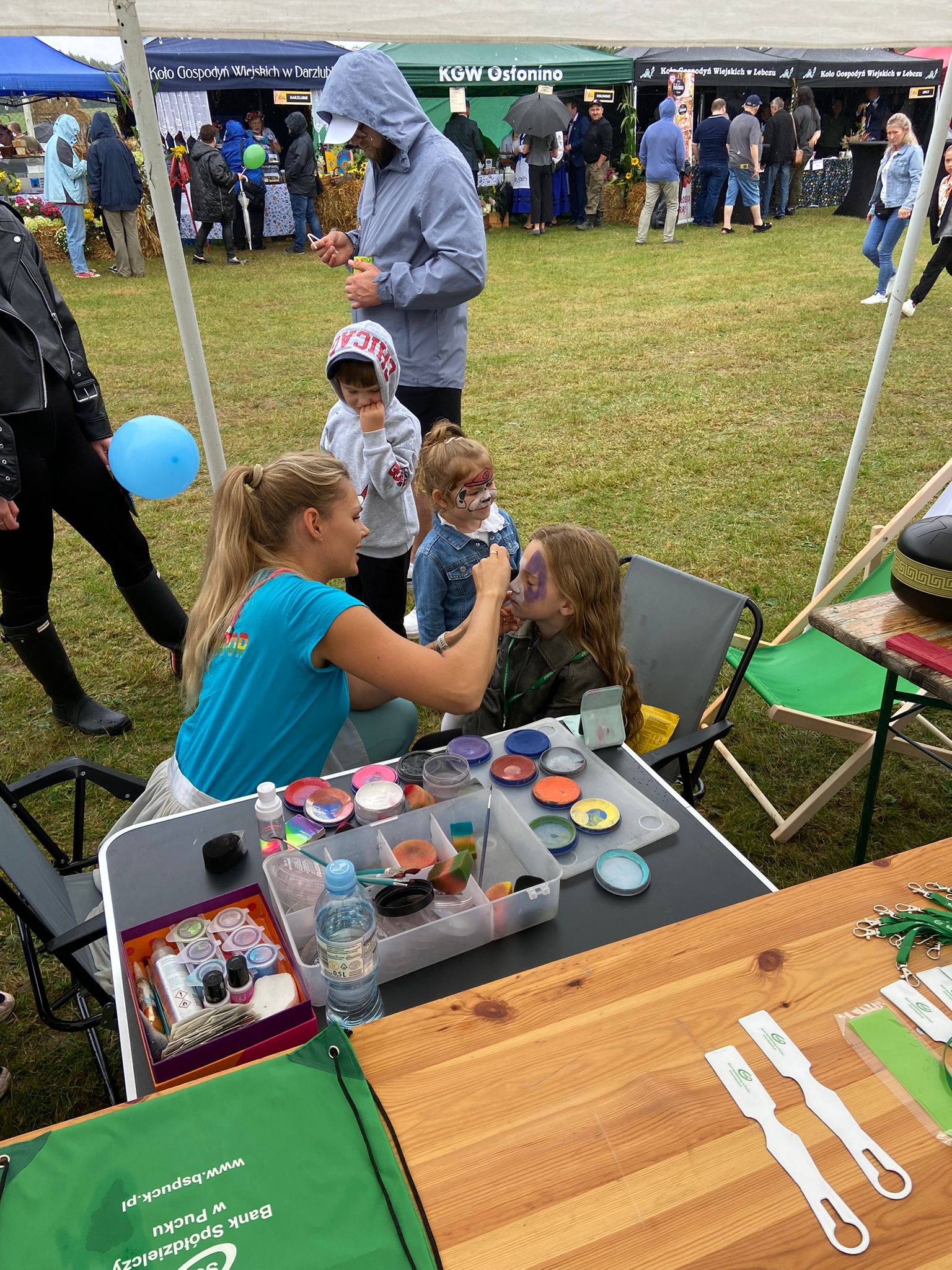 Na naszym stoisku również panowała radosna atmosfera. Odwiedzający mogli otrzymać zielone baloniki, długopisy, torby oraz inne upominki. Jedną z ulubionych atrakcji najmłodszych było malowanie twarzy – dzieci z radością wybierały wzory, a potem z dumą prezentowały swoje kolorowe buzie. Dla dzieci również przygotowaliśmy specjalną strefę baniek. W ramach zajęć kreatywnych najmłodsi uczestnicy mogli samodzielnie dekorować bawełniane worki-plecaki, rozwijając wyobraźnię i zdolności plastyczne.